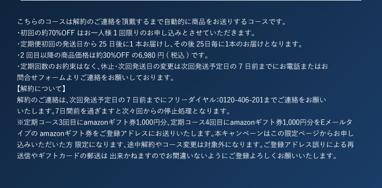 ■停止・解約のご連絡は、次回発送日の7日間までにフリーダイヤル:0120-406-201までご連絡ください。